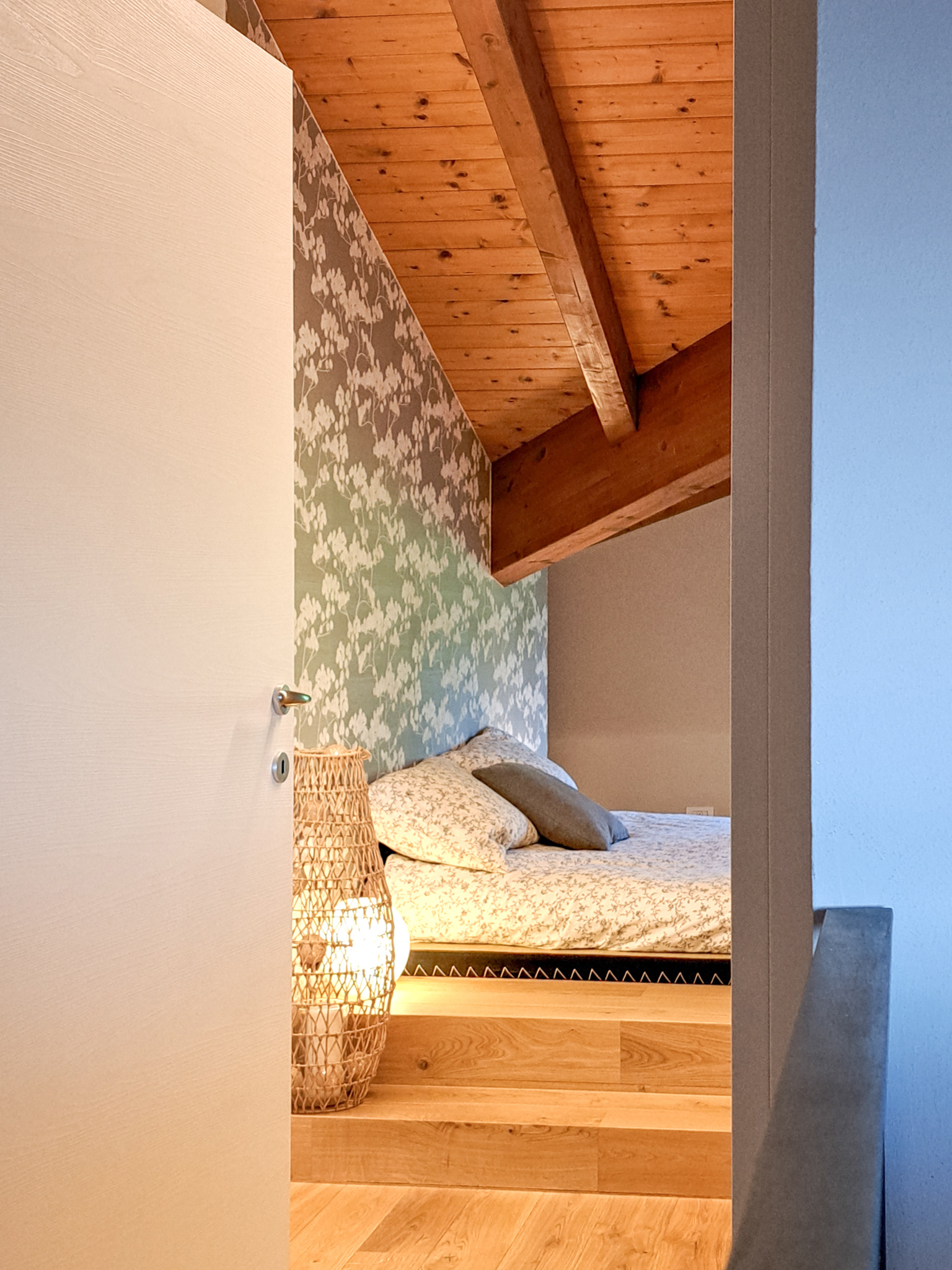 Questo appartamento sulle colline è stato ripensato per una famiglia giovane con due figli, un ragazzo e una bimba. Il progetto di relooking ha rinnovato l’atmosfera, scegliendo uno stile scandinavo con tocchi vintage, aprendo gli spazi per una maggiore convivialità e creando una suite privata per i genitori nella mansarda. La cucina è stata completamente aperta per poterla mettere in comunicazione con il living, da cui è separata ora solo da un’isola con zona colazione. Verso l’ingresso invece si è optato per una separazione, che permettesse di ottenere una zona filtro, arredata con un armadio antico usato come guardaroba. Nella mansarda, si è creato uno spazio letto dal mood orientale, con pedana e tatami, separata da una quinta rivestita in carta da parati rispetto alla cabina armadi retrostante. Il nuovo layout ha valorizzato il disegno del tetto in legno a vista, trasformandolo in vero elemento decor dello spazio.