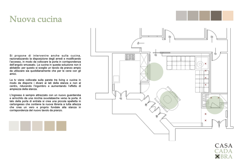 Il progetto di relooking di questa zona giorno di una bella casa del centro storico, raccoglie il desiderio dei proprietari di aggiornare gli spazi e gli arredi alle nuove esigenze della famiglia. La casa è ben disegnata ed elegante, ma non si adatta più alle necessità di una coppia con una bimba, con nuovi oggetti e nuovi usi. Ad esempio l’attuale ingresso, scenografico, è troppo ampio rispetto al resto del living e non svolge alcuna funzione contenitiva. Si propone di ridisegnarlo, ricavando un piccolo guardaroba e una nicchia con ripiani che faccia da comodo svuotatasche. L’area pranzo è oggi occupata da un grande tavolo dalla linea troppo contemporanea che non si accorda con lo stile più caldo e confortevole della casa. Qui si propone di scegliere un tavolo rotondo, più compatto e decorativo. Anche la cucina potrebbe essere modificata negli arredi oppure aperta verso il living cambiando le abitudini di uso della famiglia.