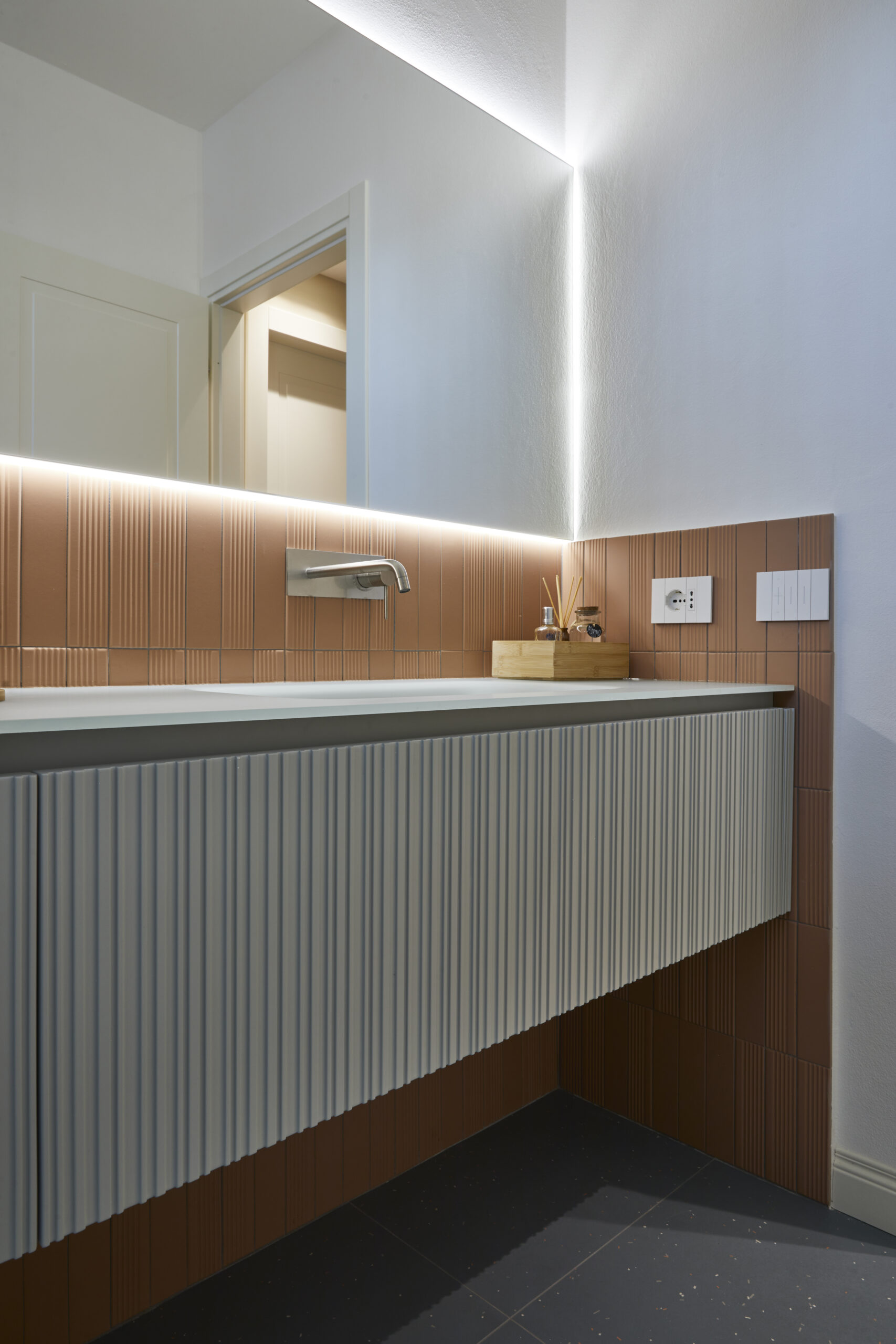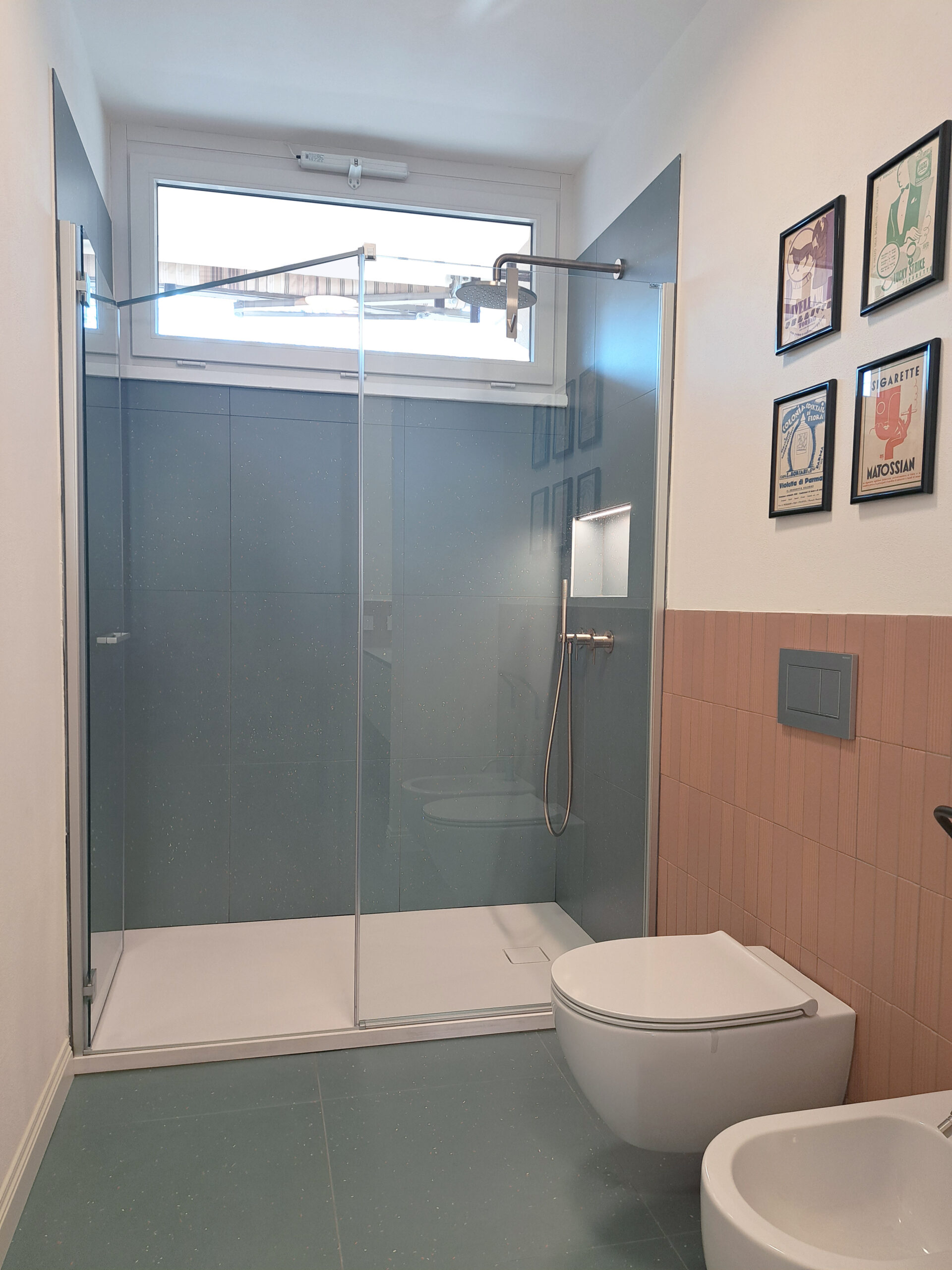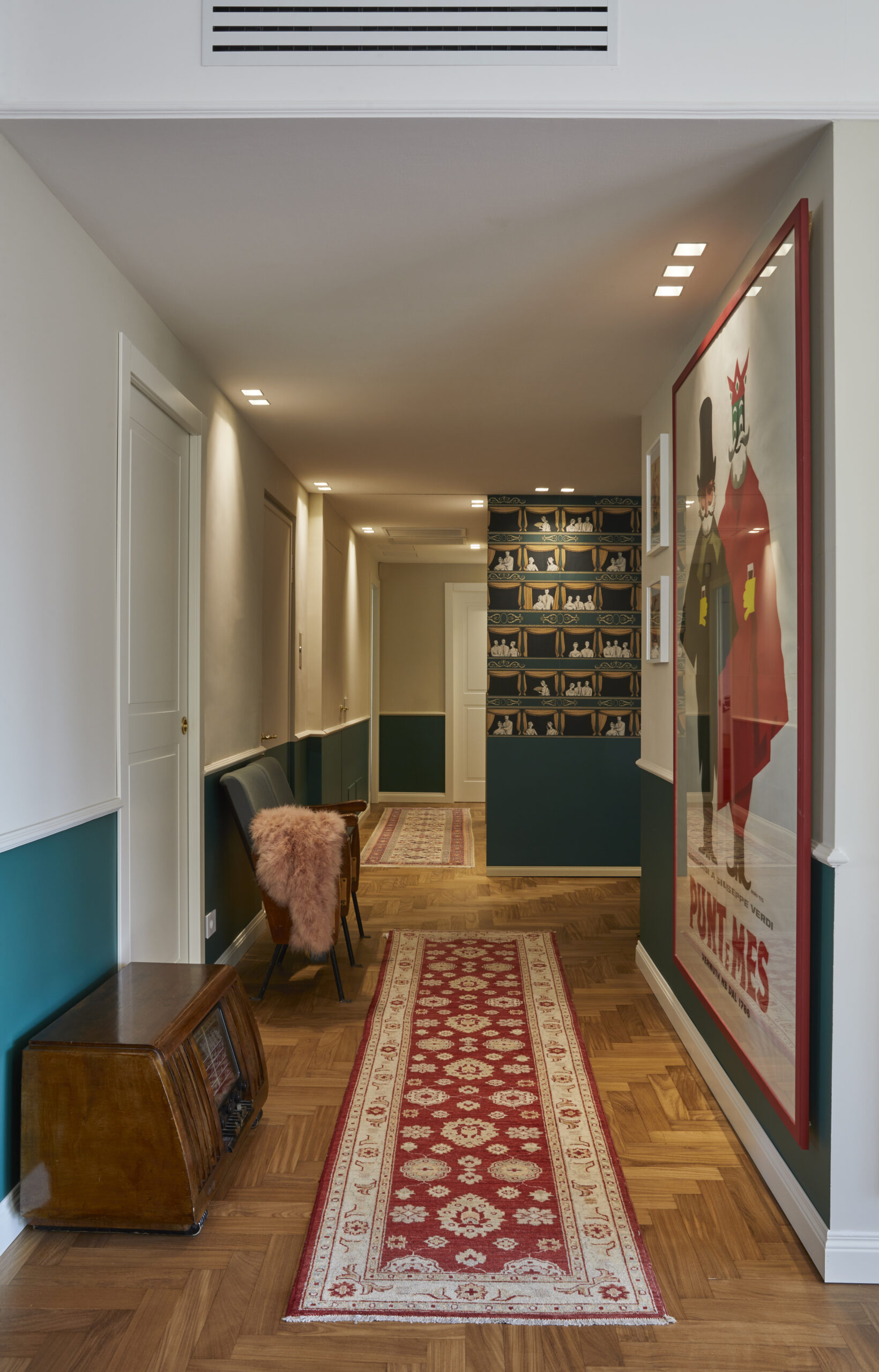 Il mondo vivace dei proprietari si sviluppa ulteriormente nel corridoio, rinnovato con una porta scorrevole a doppio battente decorata con una carta da parati di Fornasetti. Questo elemento architettonico, con il suo sfondo colorato, accoglie i visitatori ed al contempo divide gli spazi con eleganza. La cucina, anch’essa caratterizzata da un tocco di colore pop, presenta piastrelle studiate per complementare l’arredamento attraverso un gioco di colori e contrasti. I bagni, infine, rispecchiano appieno il mondo colorato e vibrante della casa, dove tonalità pastello si abbinano a soluzioni di forte impatto, creando ambienti sorprendenti e pieni di personalità.